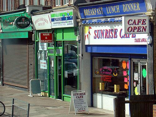 Next to an Irish pub which is the size of a sandwich-shop (with shutters down) is a half-sized hair-cut salon, next to which is a half-sized aquarium shop (where presumably you can buy exotic fish for your domestic fish-tank) , next to which is a “greasy-spoon” cafe where professional tradespeople eat breakfast lunch and dinner heartily. I have travelled past these shops for several years – but I have never noticed the pub to be open, nor the hairstylist or aquarium shop to be frequented by clients – and only the cafe to be occupied by a lone “white van” driver dining for “all-day” breakfast and causing a traffic-jam which irritates the bus drivers due to his inconsiderately parked-van.
